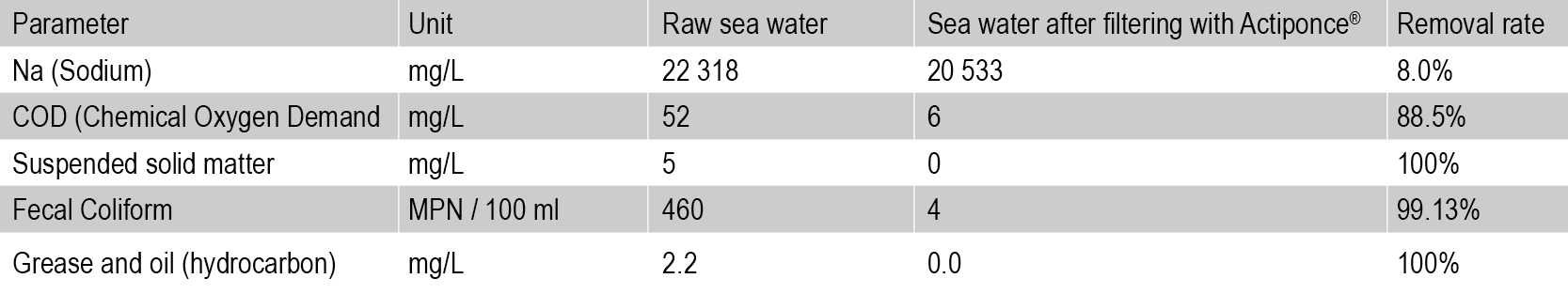 Table 1: Efficiency of removal of various undesired substances from seawater, filtered by Actiponce®