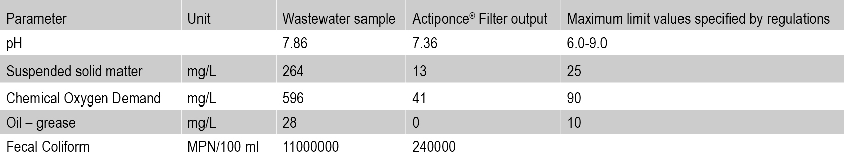 Table 2: Treatment results for wastewater filtered using Actiponce®